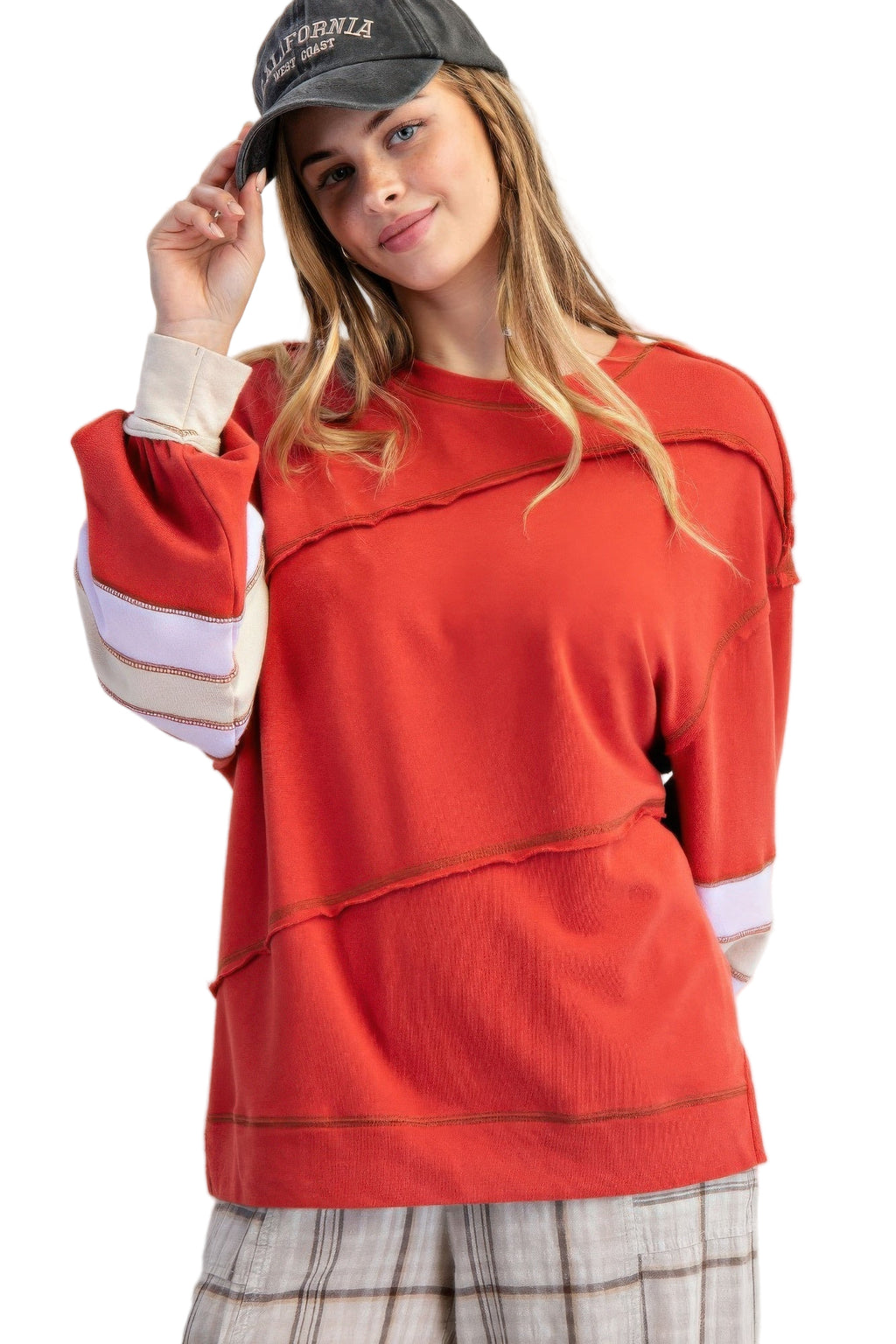 Met een kleurblokontwerp en bloemenborduursels langs de mouwen, straalt deze pullover creativiteit uit. De ruwe snijranden, asymmetrische naden en zijuitsparingen aan de zoom geven het een casual, gedecentraliseerde look. Afgewerkt met geribde manchetten en zoom voor extra comfort, is deze pullover perfect voor gezellige dagen, creatieve uitjes of om over je favoriete basics te dragen.