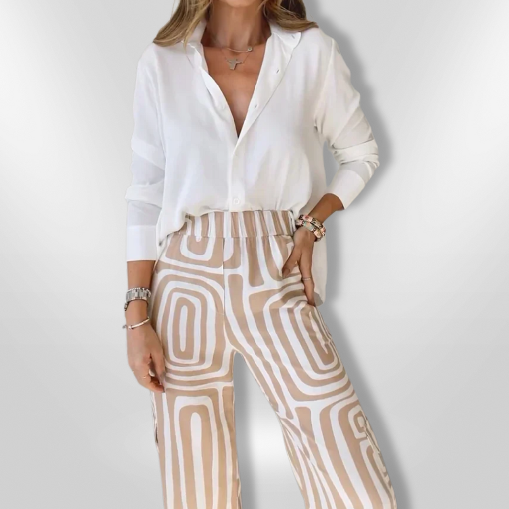 De set bestaat uit een klassieke witte blouse en een opvallende geometrisch geprinte broek. De combinatie van neutrale tinten en een losse pasvorm zorgt voor een flatterende en comfortabele look, ideaal voor elke gelegenheid.
