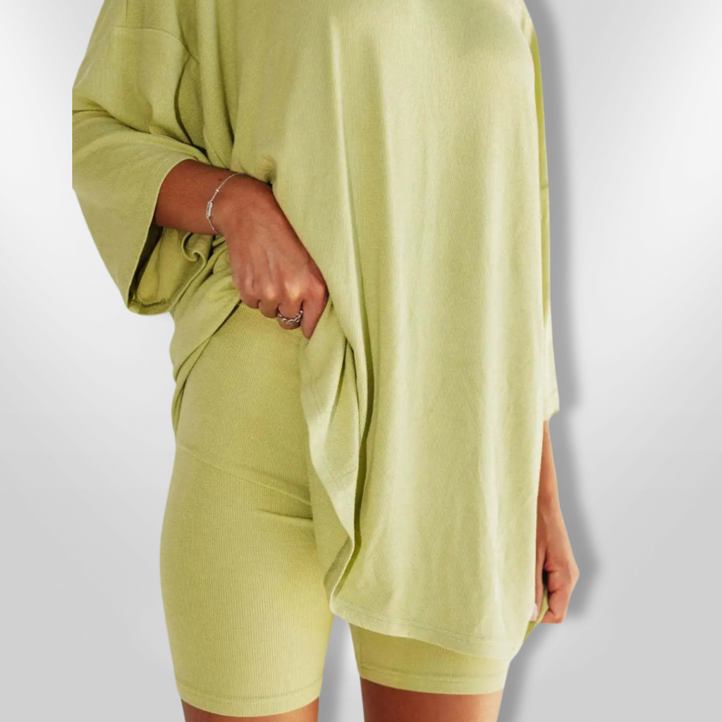 Met een oversized top en een relaxte short is dit setje ontworpen voor een moeiteloze look. Het zachte materiaal en de neutrale kleur maken het een veelzijdige keuze voor elke gelegenheid.