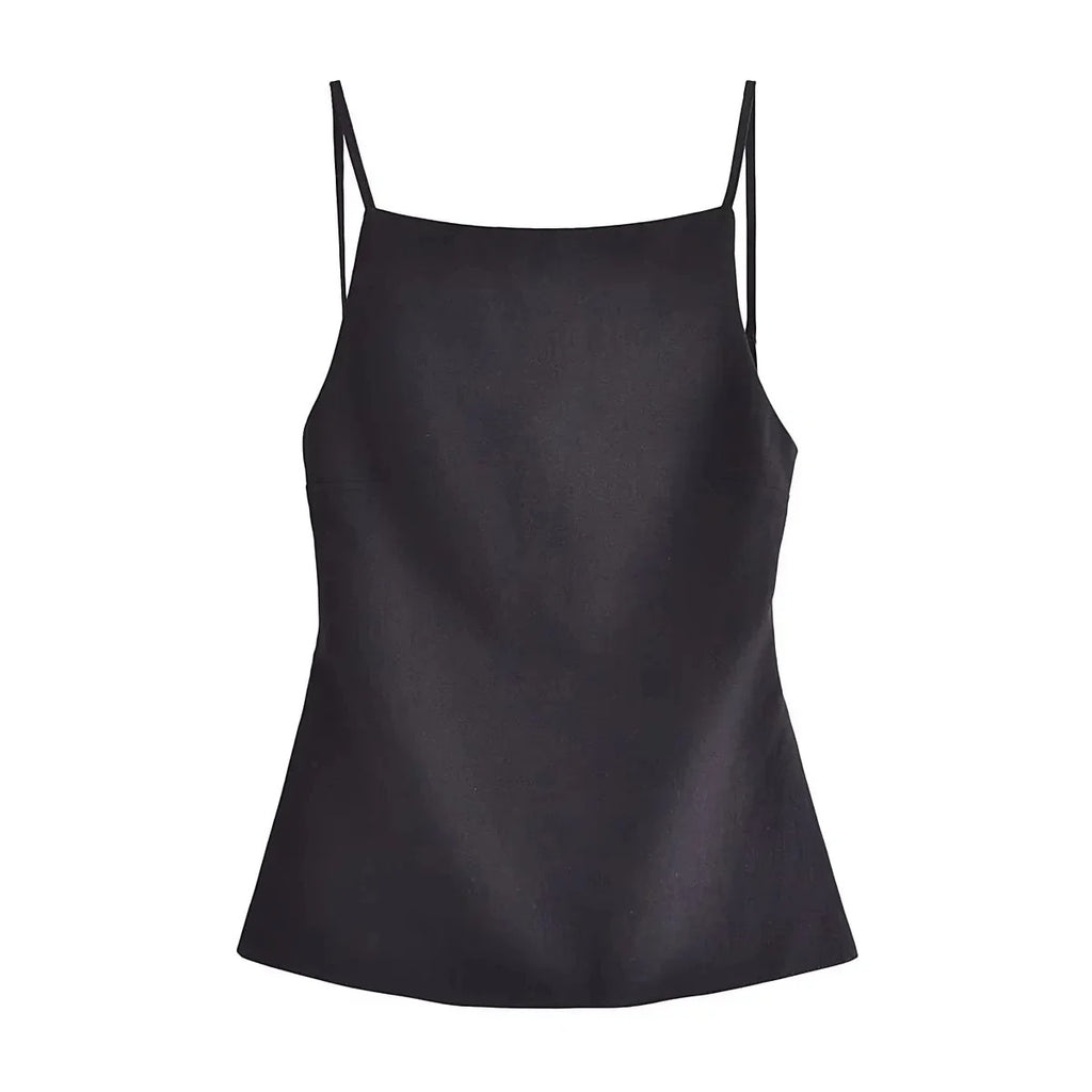 Deze crop top met dunne bandjes heeft een rugloos silhouet en een slanke, nauwsluitende pasvorm voor een gedurfde maar cleane look. De lichtgewicht stof en minimalistische snit maken hem perfect om in laagjes te dragen of solo op warme dagen. Ontworpen om comfort en statement stijl in balans te brengen.
