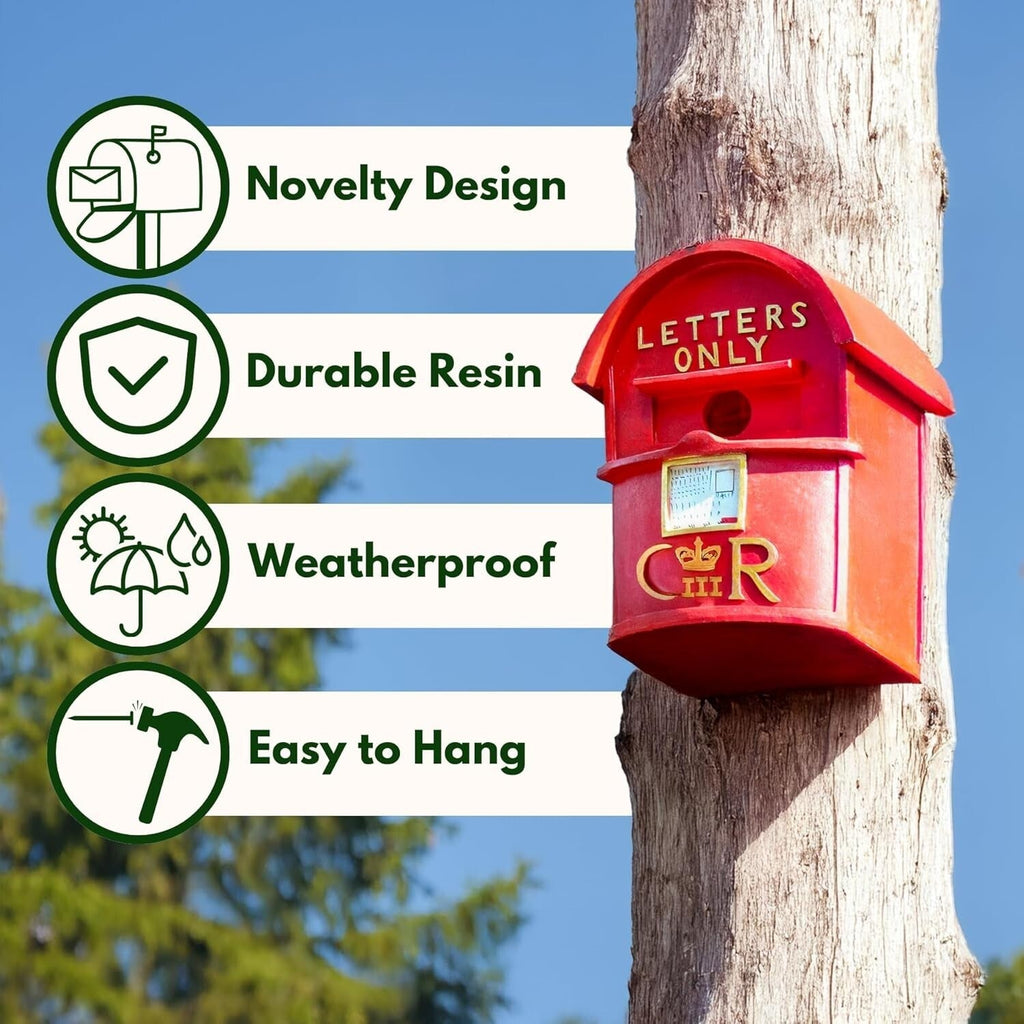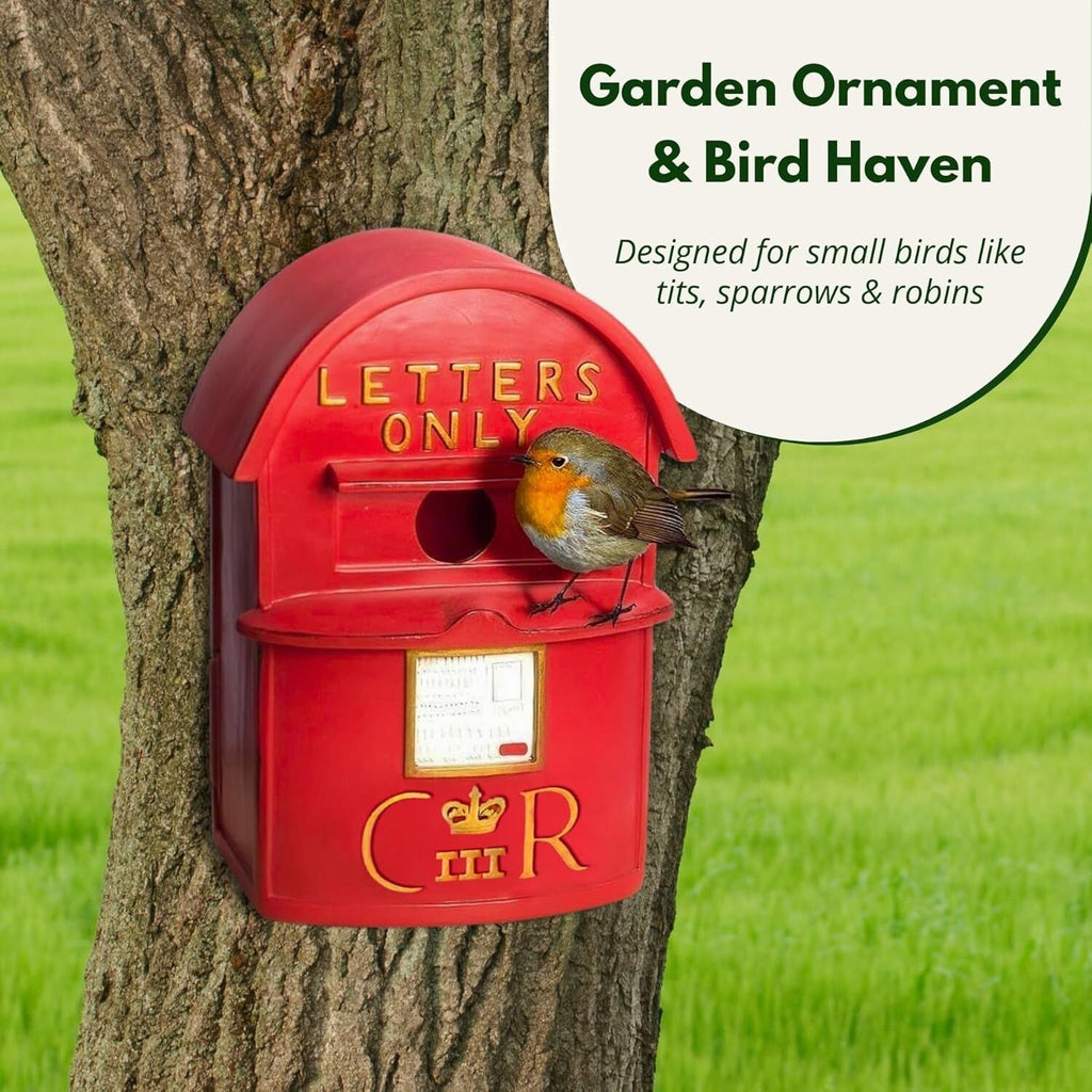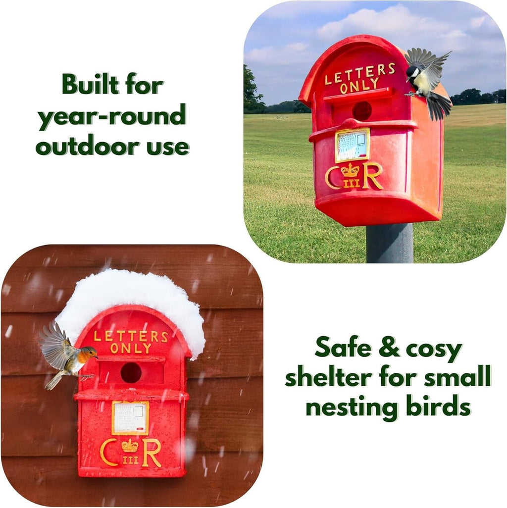 Het decoratieve ontwerp met een brievenbus-inspiratie voegt een speels accent toe aan elke buitenruimte. Het ruime interieur biedt een beschutte omgeving voor vogels om te nestelen en hun jongen groot te brengen.
