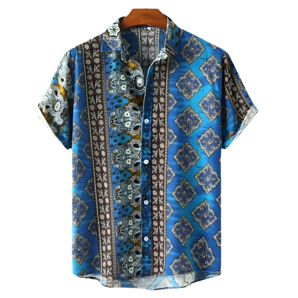Dit overhemd biedt een perfecte combinatie van comfort en stijl, met ingewikkelde patronen in rustgevende blauwtinten. Het is ontworpen voor degenen die houden van artistieke flair en is ideaal voor casual uitjes of ontspannen bijeenkomsten.
